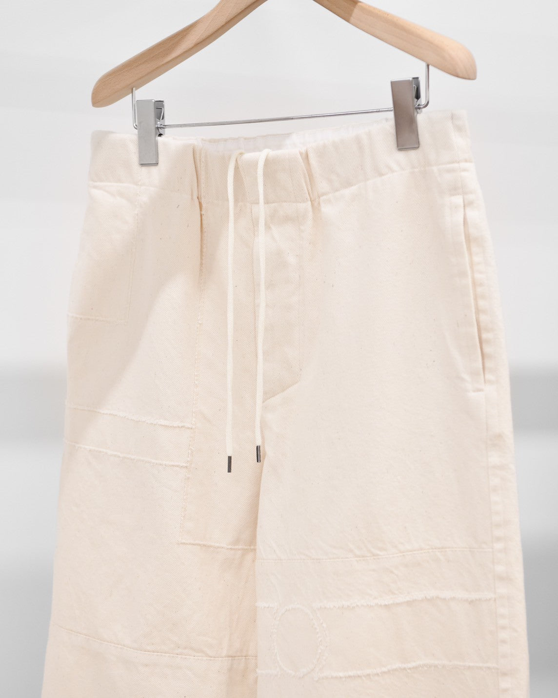 太番手で甘く撚った柔らかいデニム生地です。シルエットは少し太めのストレートシルエットで、ドローコードつきウエストゴム仕様。